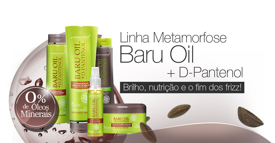Feito a base do óleo de Baru com D-Pantenol recupera os cabelos desfibrados, sensibilizados por quimicas e danos causados pela ação do tempo. Reativa o brilho e fortalece os fios. Possui efeito anti-frizz, elimina as pontas duplas, estimula o crescimento e atua na proteção térmica.