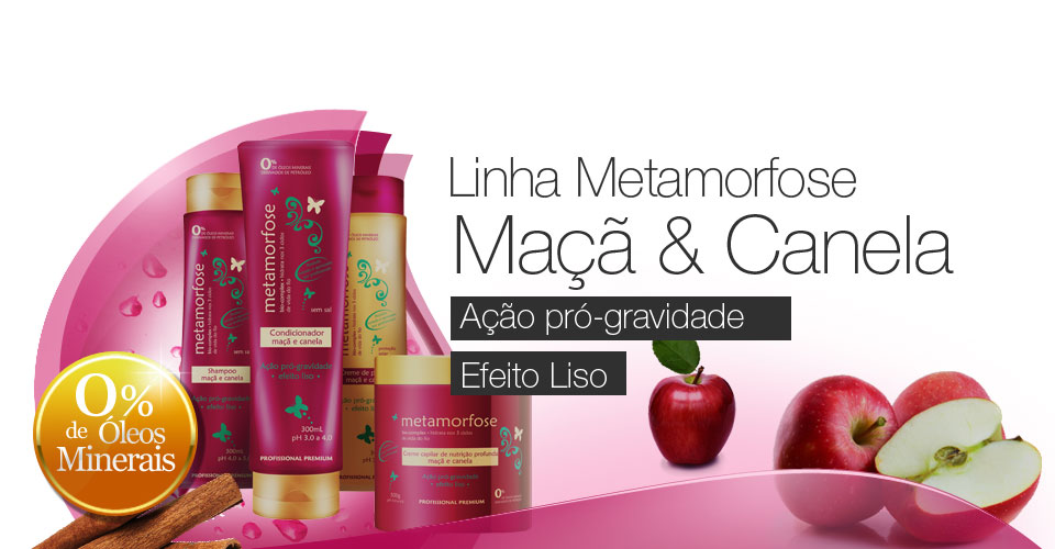 Contém os principios ativos da maça, canela, soja, trigo, queratina, ceramidas e também polimeros de alta aderência que prolongam o efeito liso nos cabelos escovados. A maça e a canela oferecem os nutrientes e sais minerais necessários para fortalecer os fios.