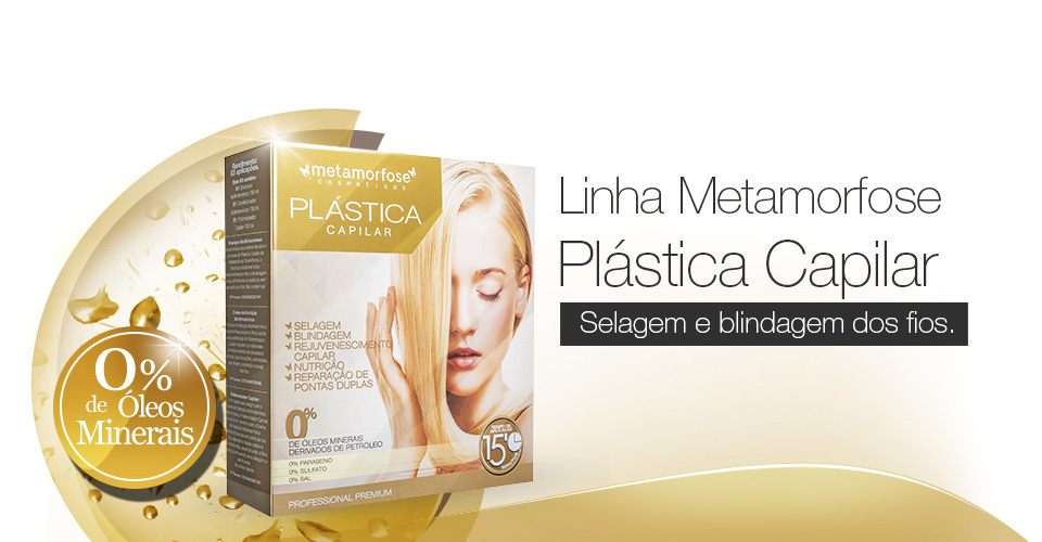 A Plástica Capilar Metamorfose Cosméticos é um sistema de selagem e blindagem dos fios, que proporciona rejuvenescimento capilar, brilho, maciez, sedosidade, nutrição, repara e elimina as pontas duplas. Desenvolvida a partir da alta tecnologia do ácido lático e ácido hialurônico, é livre de óleos minerais, petrolatos, parabenos, sulfato e sal. A Plástica Capilar é compatível com qualquer química, e indicada para todos os tipos de cabelos.